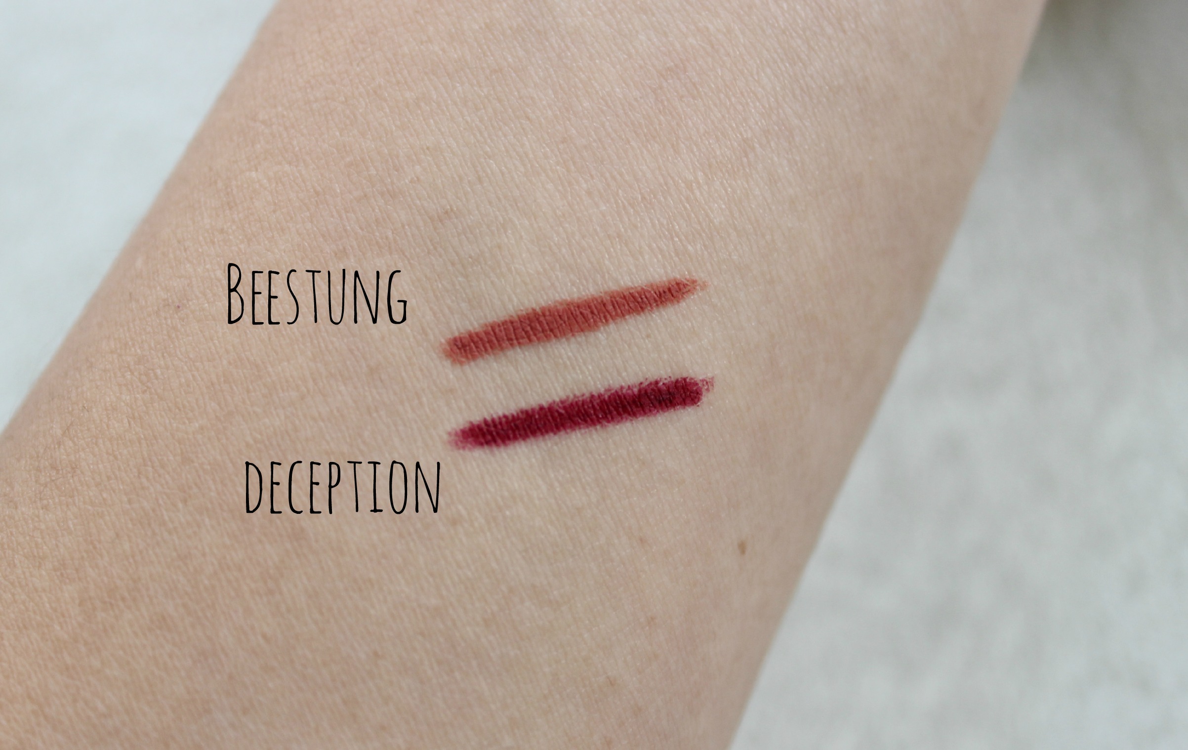 topshop beauty cosmetics makeup swatch makeup liplinersFor the lip liners, I got Deception and Bee Stung. I have one lip liner from Topshop already so I already know I’m going to like these.