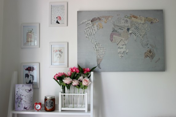 home decor office shelf wall art flowers Previous Next Published March 12, 2016 at 3162 × 2097 in Home Style: Desk/Makeup Space home style, home decor, homestyle, home decorating, room style, room decor, flowers, test tube vase, wall art, world map, candle, ladder shelf, shelfie, kmart, the warehouse