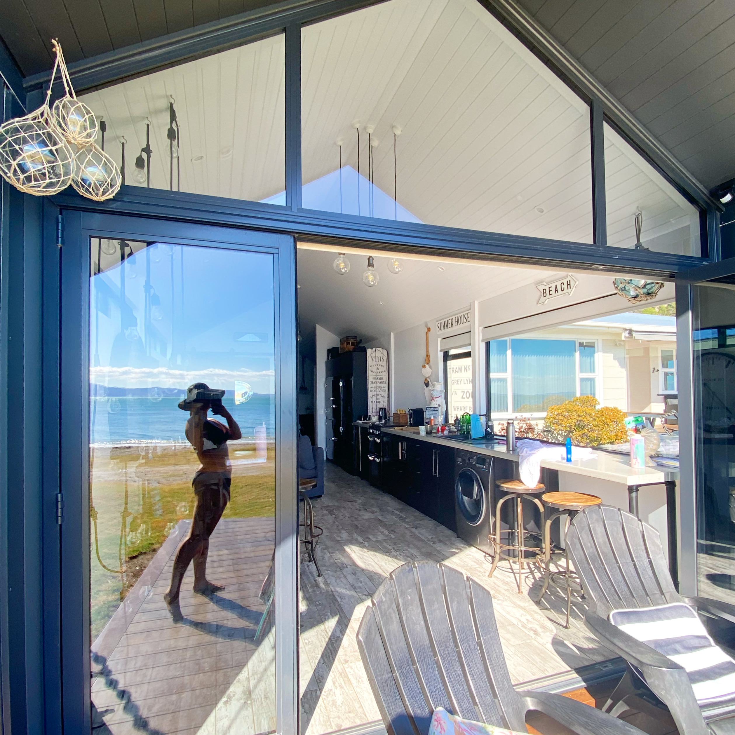 The house is only one of a very few houses that fronts the beach. It’s a pretty quiet beach when we were there. I think the length / design of the building was inspired by the trams beside it that were originally from Auckland and converted to baches. There are a few of these around the Coromandel.