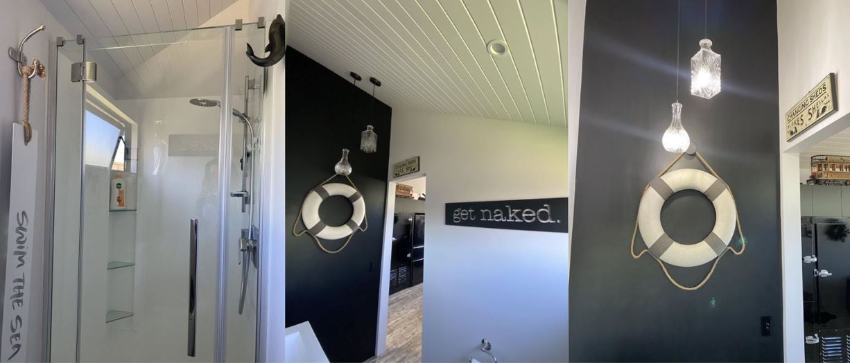 The bathroom is tucked to the side and is clean and spacious. The shower is nice and the water pressure is a lot! The beach/coastal decor is also continued in the bathroom. I didn’t take a photo but the hand towel rail is a dolphin tail which was cute.
