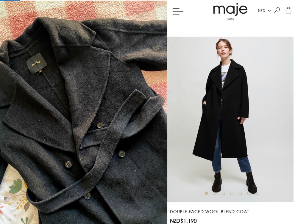 The Maje coat I found on the left is 100% cotton but to give you an idea, currently a wool blend coat on their website is over $1k! I’m actually glad my coat is cotton because it’s more suitable for Auckland winters. The length and style of my coat is like the photo on the right though.