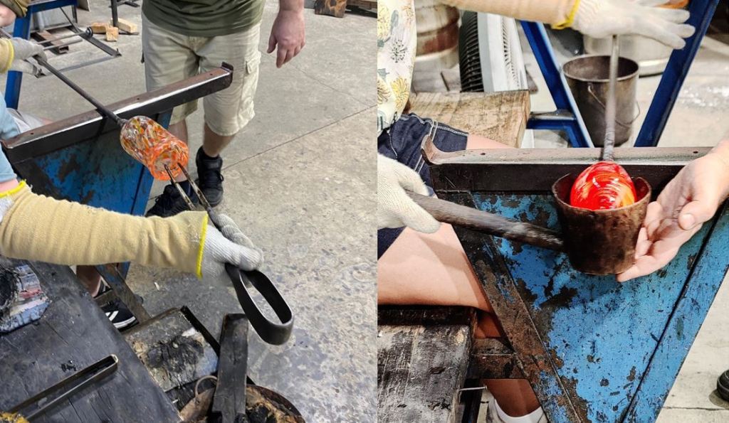We had 3 hours to create 3 things and he helped us the entire time. We started off small by creating a clear glass blob, then a paperweight and then a choice of either a bowl or cup/tumbler. It was quite a process and I didn’t really know what to expect before this workshop. Handling glass is hard work but it was fun. We chose the colours too and there were so many to choose from.