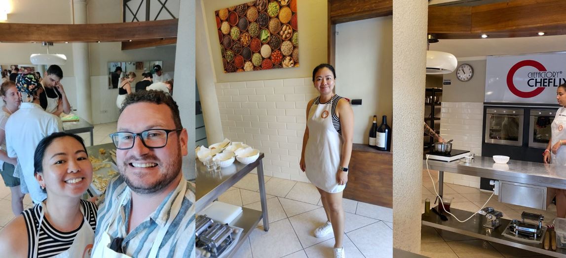 It was a big group but we were split up into 4 tables with a chef guiding us per table. We made 3 different pasta: fettuccine, ravioli and gnocchi. We also made panna cotta for dessert. We really enjoyed it. Max loves cooking and he was great at making the ravioli! We made the different sauces too. The cooking of the pasta was left with the staff as we sat back down in the dining area, had wine and waited for all our dishes to cook.