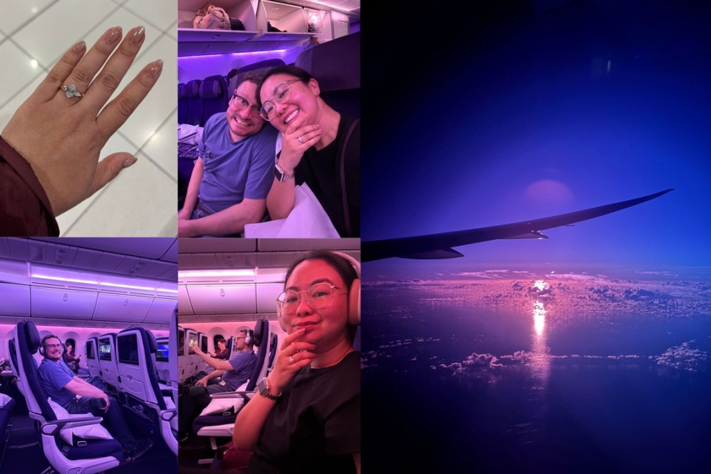 Our flight was at night time and it was exciting even before we boarded that plane because we got to pick up my engagement ring!. We did view it the weekend before and I was speechless seeing it for the first time in all its sparkly glory. We got to start this trip by having my ring and I wore it instantly as I felt safer doing so rather than having it in the box inside our bag.