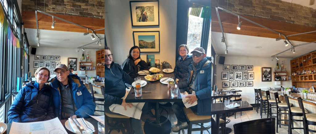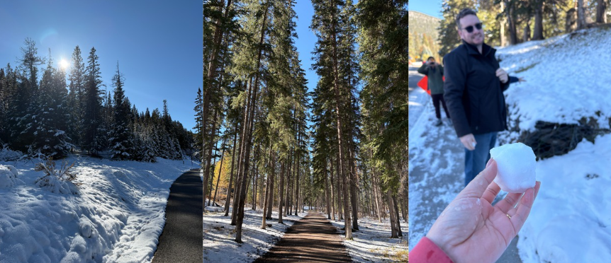 I remember us taking breaks for a few reasons: we were so full from lunch, it was getting hard to breathe and walk uphill due to the altitude, the snowy boardwalk was slippery and Max had to accept the job offer up in Sulphur Mountain as he was getting chased. I can’t remember what time it was back in NZ but they wanted him to confirm so he did it up there.