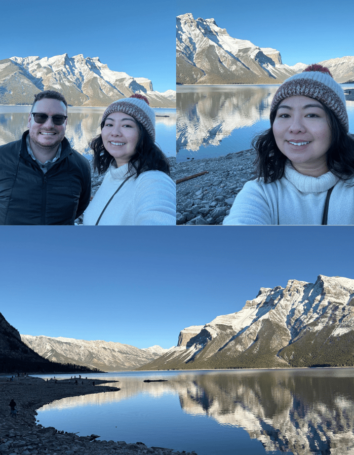 We looked tired too as we had a whole day on tour but the view from Lake Minnewanka was still surreal.
