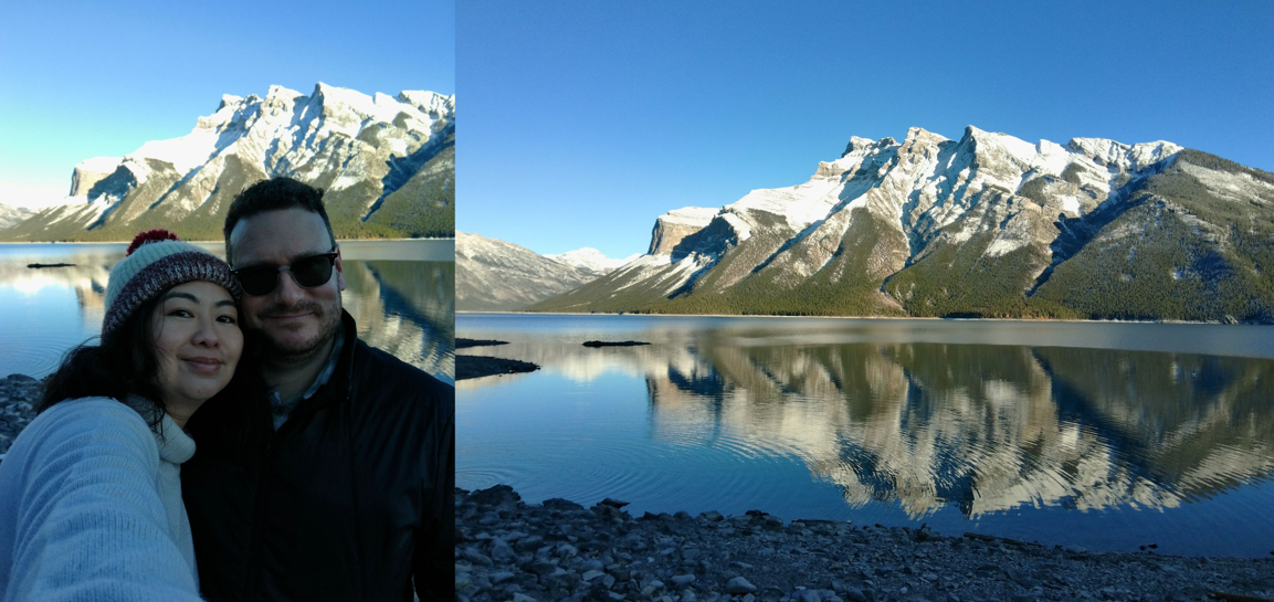 We looked tired too as we had a whole day on tour but the view from Lake Minnewanka was still surreal.